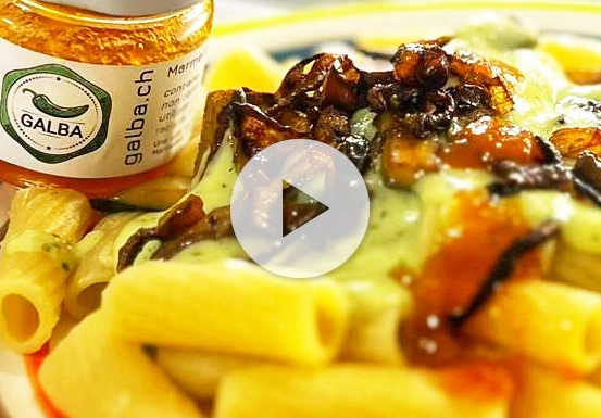 Un esempio di uso con la Raclette con una bruschetta, letto di trifolata di zucchine e melanzane, raclette, cipolla fresca e la Hot come topping!