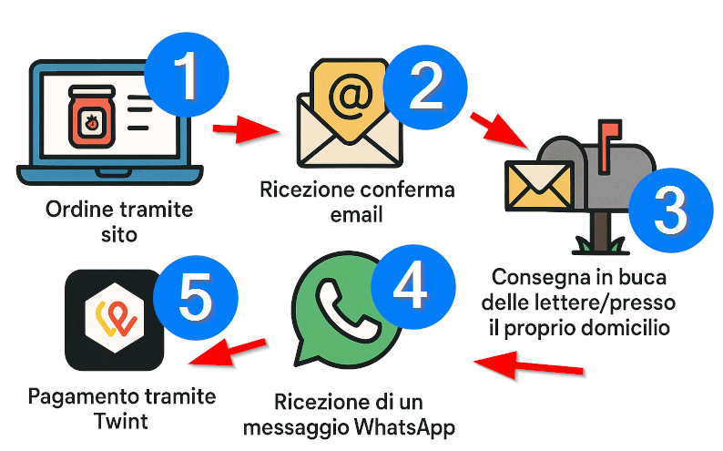 Accettazione del pagamento: Il pagamento è richiesto al momento della consegna dei prodotti e NON prima. Il metodo di pagamento accettato è UNICAMENTE tramite Twint.